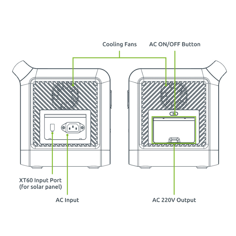 - AC Output: 1x 220-240V/50Hz 800W Rated | 1600W Max Peak